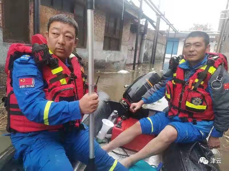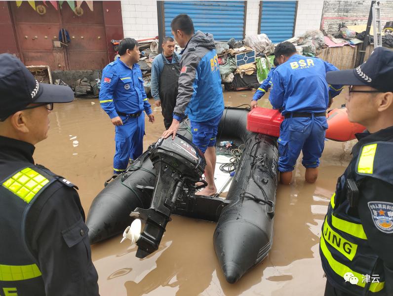9日中午,山西省晋中介休市汾河北路,天津宝坻蓝天救援队正在这里开展救援工作,搜寻被困群众、对危险建筑进行断电、紧急排水……