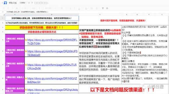 在西安读书的大三女生祁同学@小祁今年要加油 得知老家山西多地遭遇连日强降雨,为尽绵薄之力,特地建立了在线共享文档,以供大家提供救援和灾情信息,方便开展救援工作。