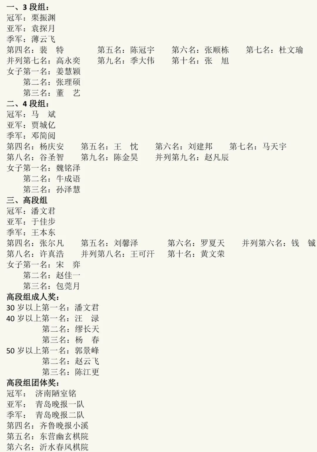 单设女子奖;高段组设团队奖、成人奖