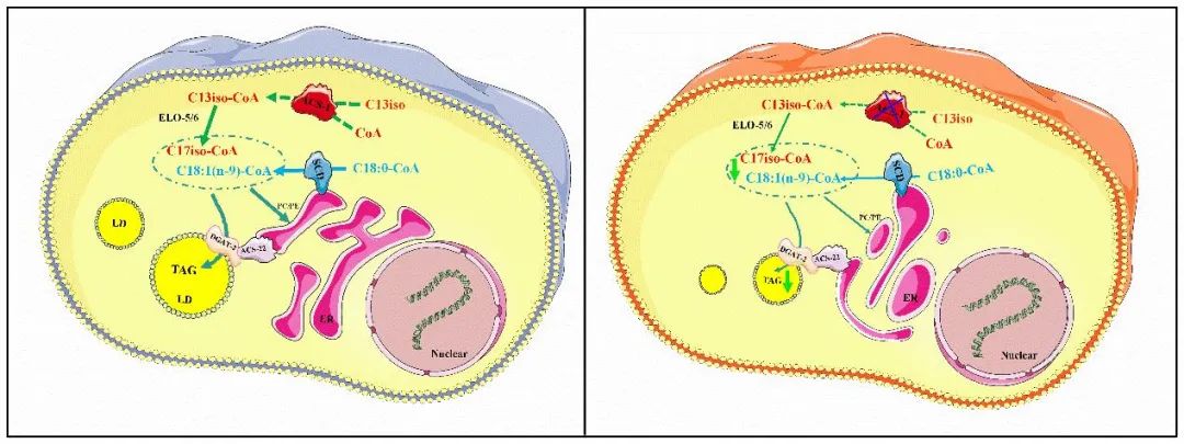梁斌团队前期工作(BMC Genomics, 2013)揭示,秀丽线虫具有非常保守的脂类代谢基因和通路,是研究脂代谢调控的良好模式生物。梁斌课题组利用秀丽线虫易于遗传筛选的优势,寻找调控脂滴大小的基因和信号通路(Genetics,2016;Journal of Lipid Research,2017;Nature Communications,2018)。本研究中,他们通过筛选同时影响内质网稳态和脂滴大小的基因,发现编码脂酰辅酶A合成酶(acyl-CoA synthetase)的ACS-1功能受阻时,秀丽线虫的单甲基支链脂肪酸C15iso和C17iso含量明显下降,内质网形态和功能受损、脂滴明显变小;通过外源脂肪酸回补实验证明C17iso是导致acs-1RNAi线虫内质网形态和功能受损、脂滴变小的关键脂质分子。进一步研究发现,C17iso作为底物,参与合成构成生物膜的主要成分磷脂酰胆碱(PC)和磷脂酰乙醇胺(PE),进而维持内质网膜形态和功能的完整性,使得驻留在内质网上的脂质合成酶(如SCD、DGAT2和ACS-22等)发挥正常功能,促进脂滴发生和增大(图1)。
