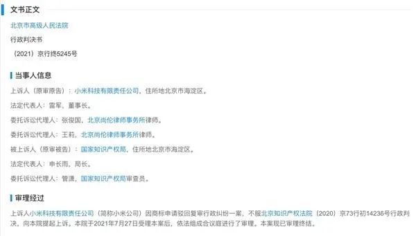 根据天眼查APP,判决书显示,小米公司因商标申请驳回复审行政纠纷一案,不服北京知识产权法院(2020)京73行初14236号行政判决,向法院提起上诉。