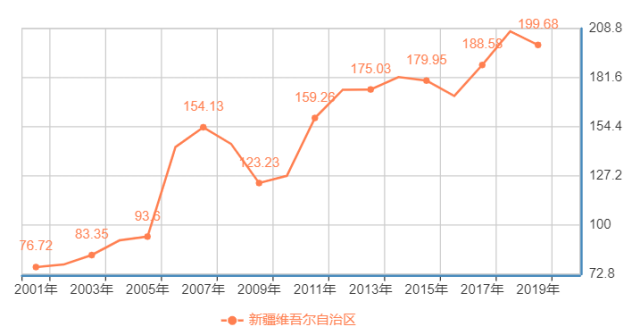 2001-2019年新疆维吾尔自治区人均棉花产量(公斤)(来源:国家统计局)