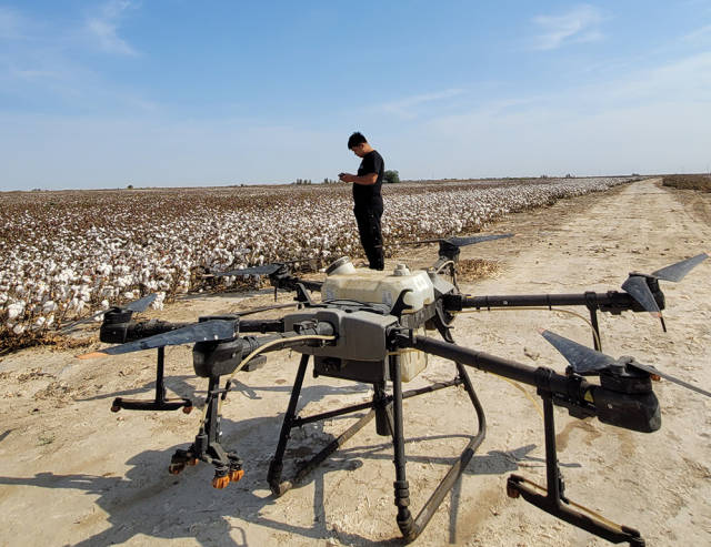 刚刚过去的新疆棉花脱叶季,植保无人机再次唱了主角。一望无际的棉田上空,一台台无人机在上空飞舞,按照事先规划好的飞行路径进行脱叶剂喷洒,简单快捷又高效,成为近年来新疆棉田里的一道独特风景。