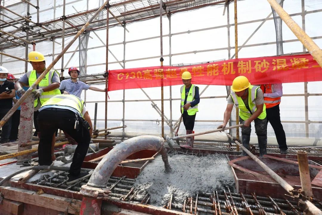 近日,中建八局在广州新世界增城发展中心项目,实现了行业内首次在实体工程建设中泵送应用C130超高强机制砂混凝土,泵送高度超过220米,混凝土抗压强度达149.5兆帕。广州新世界增城综合发展项目总建筑面积为23万平方米,共包括两栋超过200米超高层建筑,其中C1栋高度达到241米。自2020年12月始,中建八局一公司联合华南理工大学、设计事务所、搅拌站等多家单位牵头成立C130技术研发小组,经过10个月的联合攻关,终于成功试配出超高强机制砂混凝土。