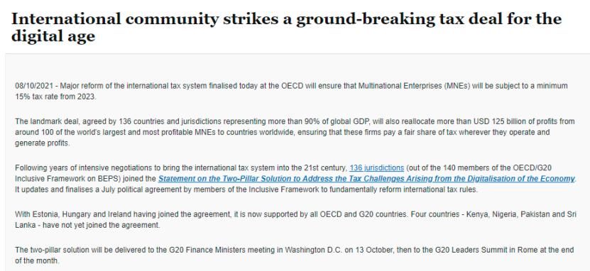 当地时间10月8日,经济合作与发展组织宣布全球公司税率改革取得重大突破。从2023年起,跨国企业(MNEs)的税率最低将定为15%。