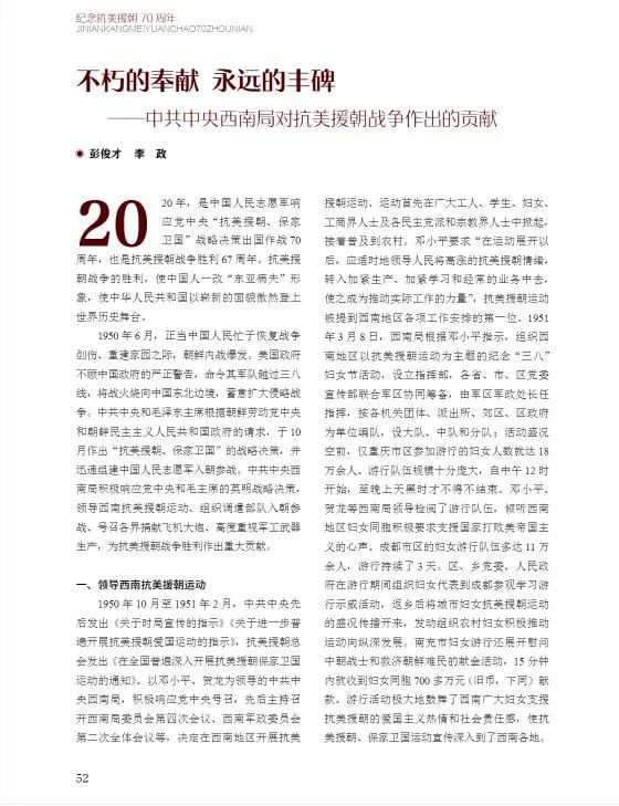 原标题:《【红色记忆 】不朽的奉献永远的丰碑——中共中央西南局对抗美援朝战争作出的贡献 ‖ 彭俊才 李政》