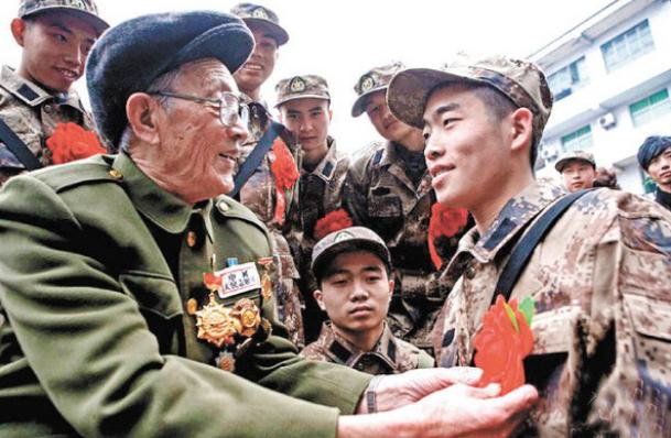 抗美援朝一级战斗英雄、特等功臣柴云振(左一),在岳池县新兵入伍欢送仪式上给新兵讲战斗故事