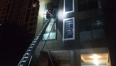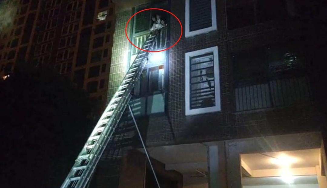 在架好救援梯后,一名消防员迅速爬上三楼,由于考虑两名孩子年纪较小,消防员将孩子一一抱下梯子,最终母女三人被成功救出。