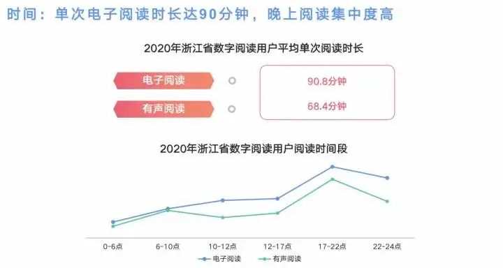 在阅读偏好上,浙江数字阅读用户偏好在晚上进行阅读,主要集中在晚间的17到22点的时段。在阅读形式方面,电子阅读占据首位,平均单次阅读时长达到90.8分钟,重度用户占比较多。
