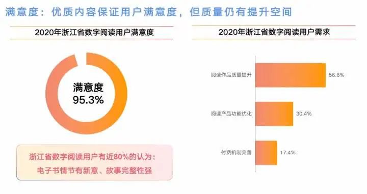 调查还显示,浙江数字阅读用户整体满意度达95.3%,有近80%的认为电子书情节有新意、故事完整性强,非常令人满意。56.5%用户则认为,数字阅读作品整体质量仍有提升空间。