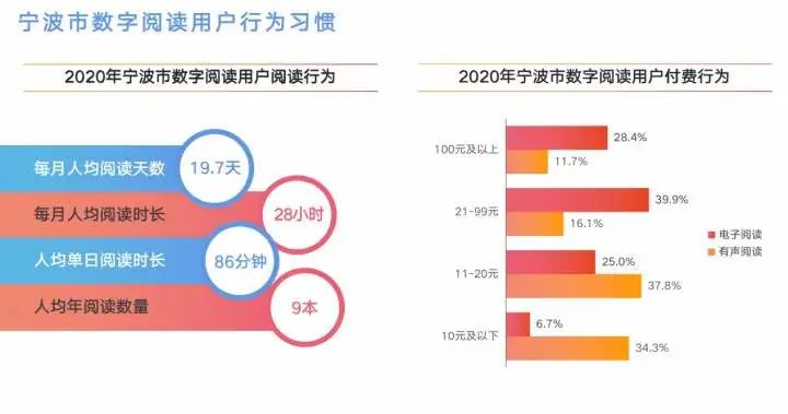 2020年,宁波市综合阅读率达91%,数字化阅读方式接触率达86.5%,其中数字阅读主要用户主要为青年学生和已经参加工作人士。宁波数字阅读用户每月人均阅读天数19.7天,人均单日阅读时长86分钟,人均年阅读数量达9本。宁波市数字阅读用户对内容质量和阅读体验的满意度达96%,高于省级满意度。