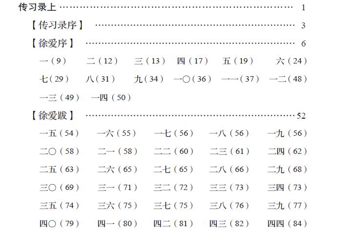 “传习录上”,即《传习录》“上卷”“中卷”“下卷”中的“上卷”,下面的“一”“二”“三”等等就是篇章序号,“一”后面的“(9)”就是代表该篇所在的页码,即第一篇在本书的第九页。如此,将索引和目录结合起来,我们就能快速定位准确位置了。