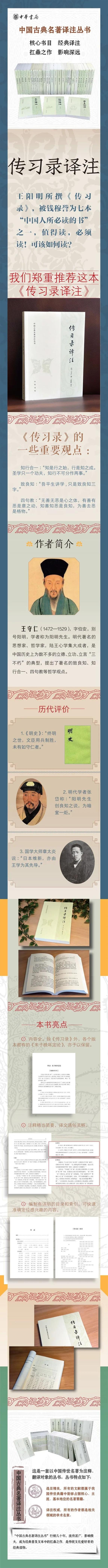 钱穆认为,《传习录》是中国人必读的七部经典之一。梁启超称,学阳明先生思想,应读《传习录》。王阳明的主要哲学观点,如致良知、知行合一、心即理、四句教等,在《传习录》中均有体现,可以说,读懂了该书,也就读懂了大半个王阳明。那么,读者应如何准确、高效地阅读《传习录》呢?我们郑重推荐王晓昕先生的《传习录译注》。