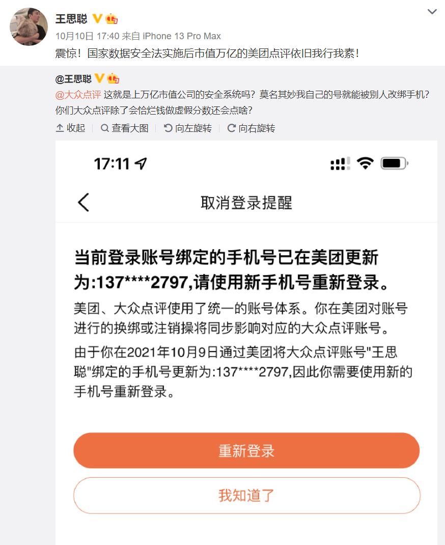该微博配发的截图显示:美团、大众点评使用了统一账号体系。你在美团对账号进行换绑或注销将同步影响对应的大众点评账号。由于你在2021年10月9日通过美团将大众点评账号“王思聪”绑定的手机号更新为:137****2797,因此你需要使用新手机号重新登录。