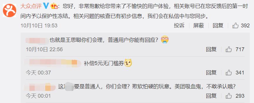 当晚,大众点评官方账号在王思聪发布的微博下回复道:“非常抱歉给您带来了不愉快的用户体验,相关账号已在您反馈后的第一时间内予以保护性冻结。相关问题的核查已有初步信息,我们会在私信中与您同步。”