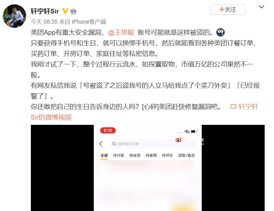而在10月11日早间,数码博主@轩宁轩Sir也发微博称,美团APP有重大安全漏洞,只要获得手机号和生日,就可以换绑手机号,王思聪的账号可能就是这样被盗的。
