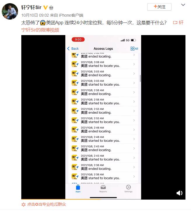 同一天,数码博主@轩宁轩Sir也在微博发视频表示:“美团连续24小时定位我,每5分钟一次,这是要干什么?”10月11日,该博主又指称美团APP存在重大安全漏洞,只要获得手机号和生日,就可以换绑手机号。