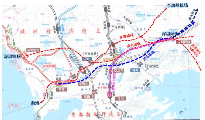协调推进深汕高铁、深大城际、莞龙城际大鹏支线早日建成投入使用,强化坪山与粤西、市中心区以及机场等重大交通枢纽的轨网衔接,同时加强深惠汕发展轴线,带动粤东地区发展;