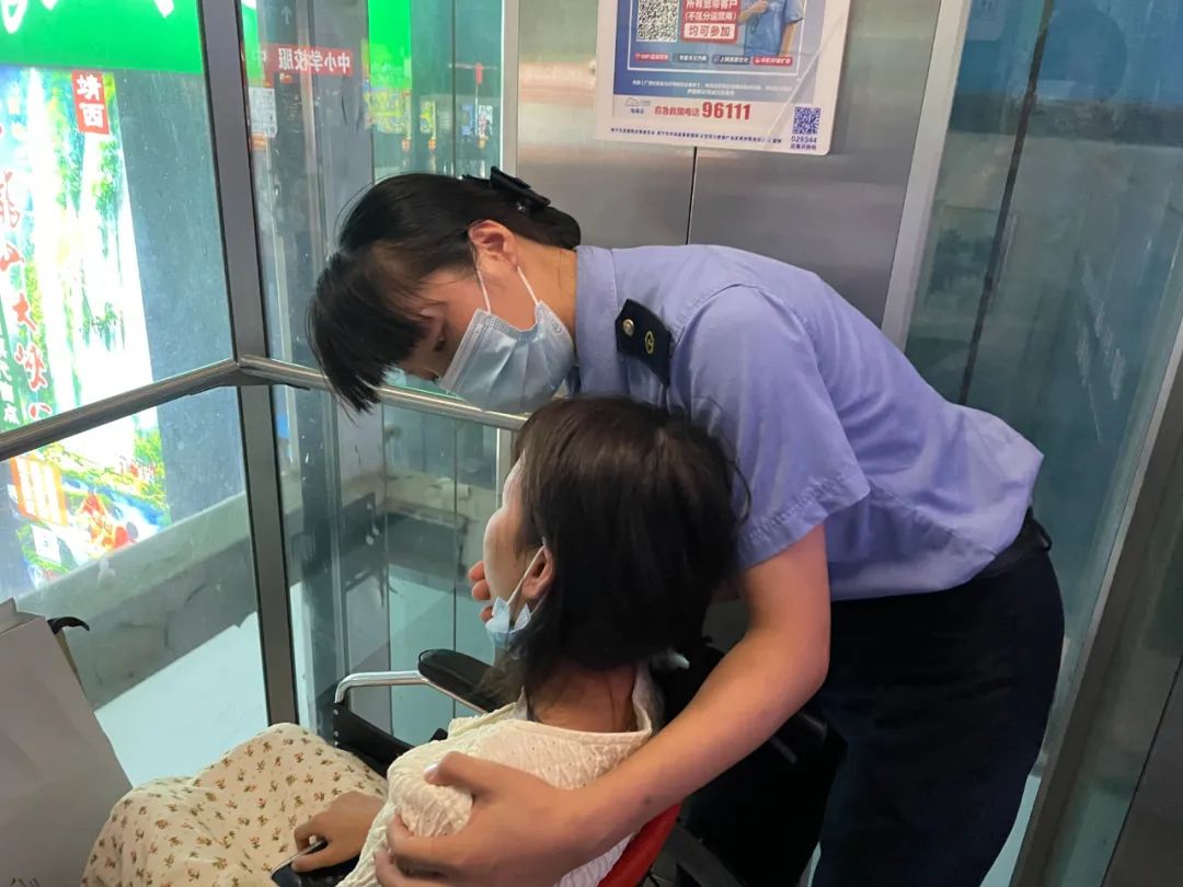 随后,刘兆坤与陶秋萍一起将旅客送往出站口驻站医务人员执勤点。6站台至出站口有将近500米距离,期间,陶秋萍一直抱住陈女士上半身,将她扶稳在轮椅上。