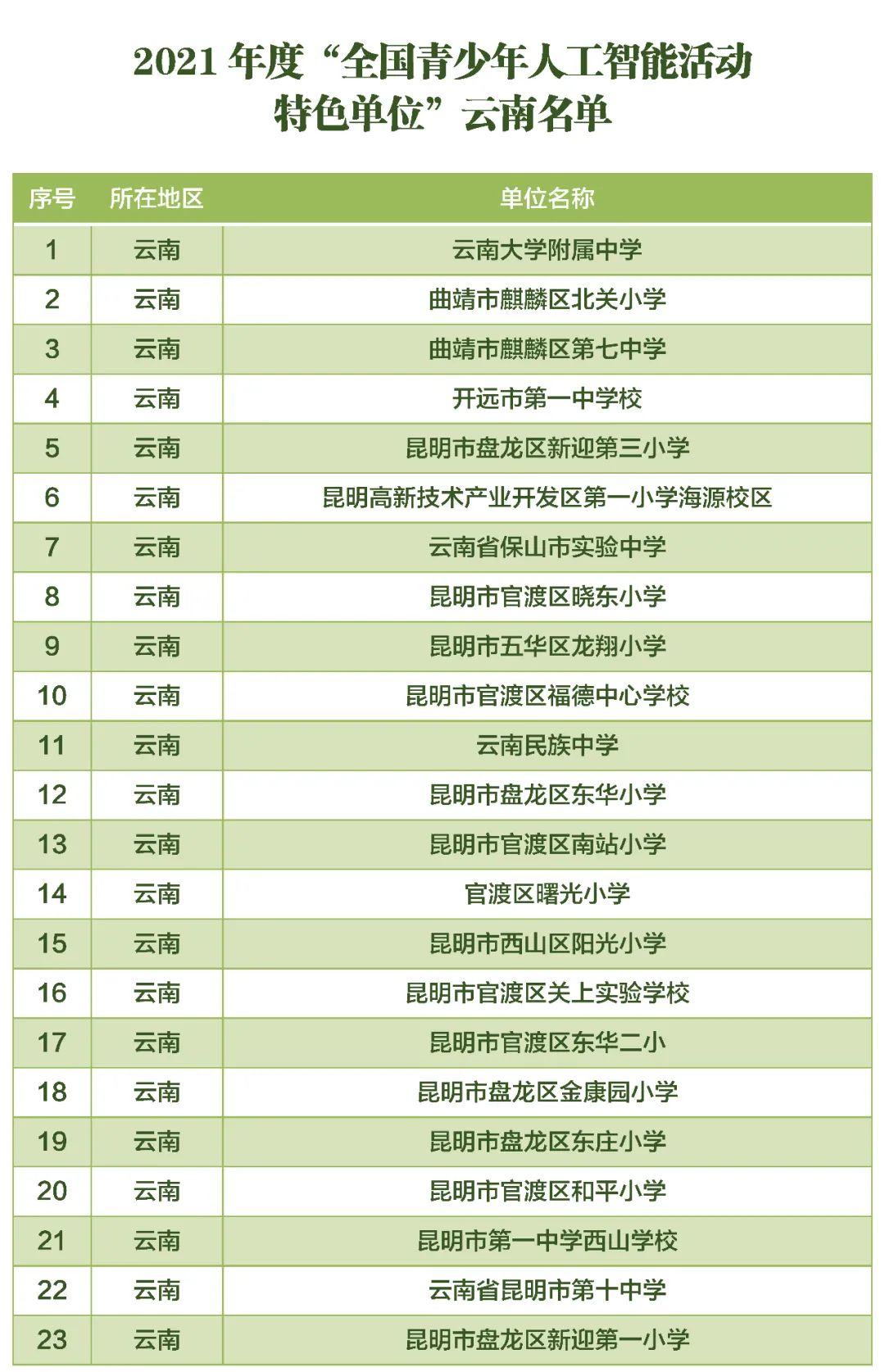 近期,中国科协青少年科技中心、中国青少年科技辅导员协会2021年度“全国青少年人工智能活动特色单位”名单。其中,云南省有47家入选。 经省级审核、资格审查和专家评选,在1640家提交申请的单位中,有999家单位被评选为特色单位。END来源:中国科协青少年科技中心、中国青少年科技辅导员协会制图:李春涛编辑:李思凡责编:余苏晏审核:张丽亚昆明教育新媒体矩阵今日头条丨微博丨新华号丨人民号原标题:《点赞丨云南47所学校入选“全国青少年人工智能活动特色单位”》