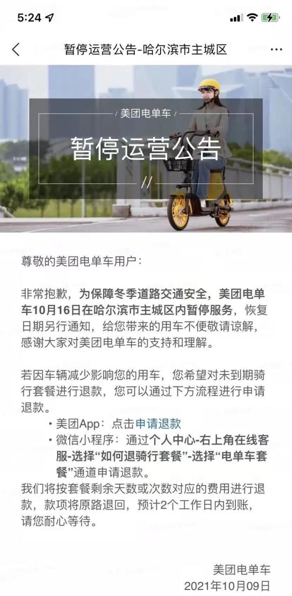 近日,美团方面发布了相关“暂停运营公告”,公告内容显示,为保障冬季道路交通安全,美团电单车10月16日在哈尔滨市主城区内暂停服务,恢复日期另行通知。若因车辆减少影响用车,可对未到期骑行套餐进行退款。