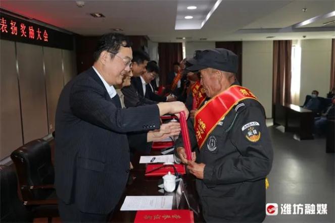10月11日上午,在阳光大厦辅楼四楼会议室内,一群身穿保安制服的人员肩披绶带,绶带上写着“潍坊市见义勇为先进个人”等字样,跟其他人相比,他们皮肤黝黑,年纪也比较大,可精神面貌不输年轻人。作为保安人员,他们并未在会场巡逻,而是端坐在会议室前排,原来他们就是今天受表扬的人员之一。