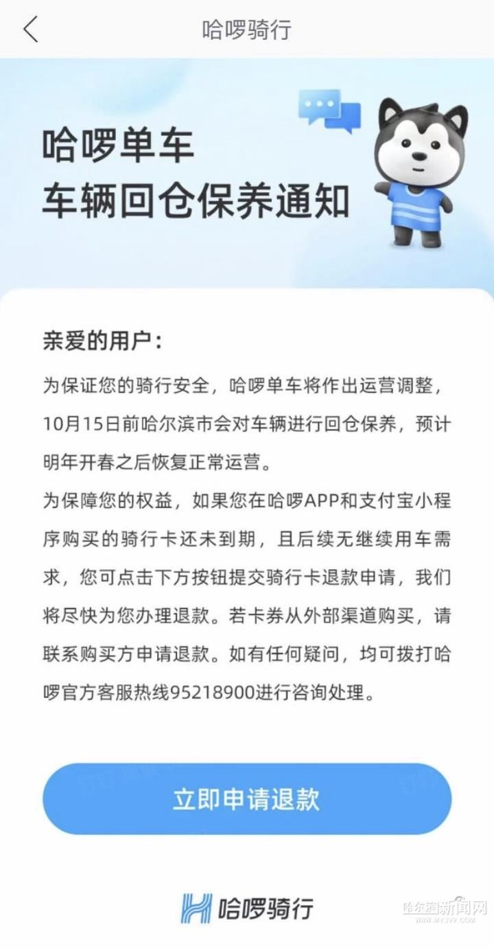 关于尚未到期的骑行卡权益,该负责人提请广大市民,可以在哈啰出行App或支付宝哈啰出行小程序骑行界面的“通知”中,直接“点击退款”进行退费。后台会根据骑行卡剩余使用时间或使用次数,进行退款,款项原路退回。据了解,哈啰在整个冬季保养期间都接受退款服务,但需要注意的是,后续没有用车需求的市民,请尽快操作退款,以免造成个人经济损失。