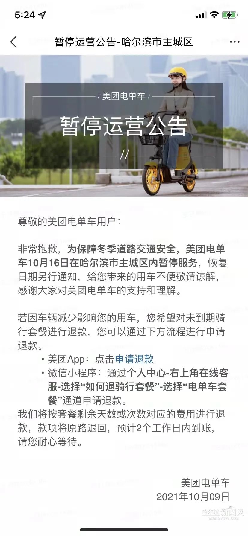 近日,美团方面发布了相关“暂停运营公告”,公告内容显示,为保障冬季道路交通安全,美团电单车10月16日在哈尔滨市主城区内暂停服务,恢复日期另行通知。若因车辆减少影响用车,可对未到期骑行套餐进行退款。