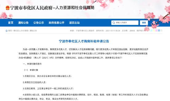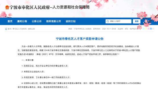 10月11日,宁波市奉化区人社局发布《宁波市奉化区人才落户奖励申请公告》及《宁波市奉化区人才购房补贴申请公告》,启动奉化区人才落户奖励和人才购房补贴两项申请。