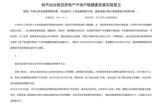 值得注意的是,前两天,哈尔滨也曾发布救市新政,打响今年“救市”第一枪。10月9日,哈尔滨市住建局、市自然规划局、市财政局等9个部门联合发布了《关于促进我市房地产市场平稳健康发展的实施意见》,一口气推出了16条利好购房与市场的新举措,主要针对为房企减负和降低购房者入市成本。
