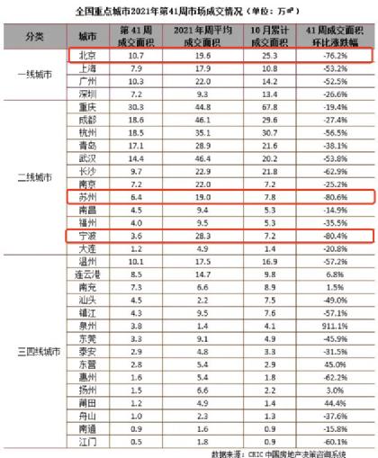 此外值得注意的是,一线城市受上周高成交基数影响,北京、上海、广州第41周成交面积环比跌幅均超过50%,尤其是北京,成交由上周45万平方米跌至本周11万平方米,跌幅高达76%。