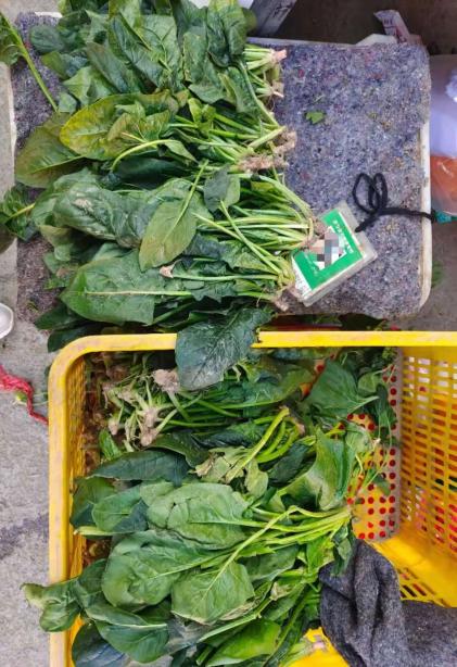 “我们卖的菠菜有本地的,也有外地的。本地的菠菜价格普遍低一点,大部分都是七、八块钱一斤。”一位正在给顾客装菜的菜商告诉记者,“但是本地的菠菜叶子小,菜杆大,不好吃,市民更喜欢外地的菠菜,那些叶子大,菜杆小,含水量大。”