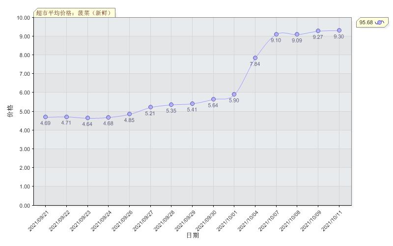 济南市发改委官网相关价格监测数据显示,叶菜价格较之前涨幅较大,到目前为止,菠菜最高价格为10元每斤,油菜价格为4元每斤,韭菜价格4.22元每斤。其中,菠菜价格从10月4号开始大幅上涨,价格最高时较9月底上涨了6元。同时,官网数据显示,鲜肉类的去骨后腿肉价格也为10元每斤,与菠菜价格相当。