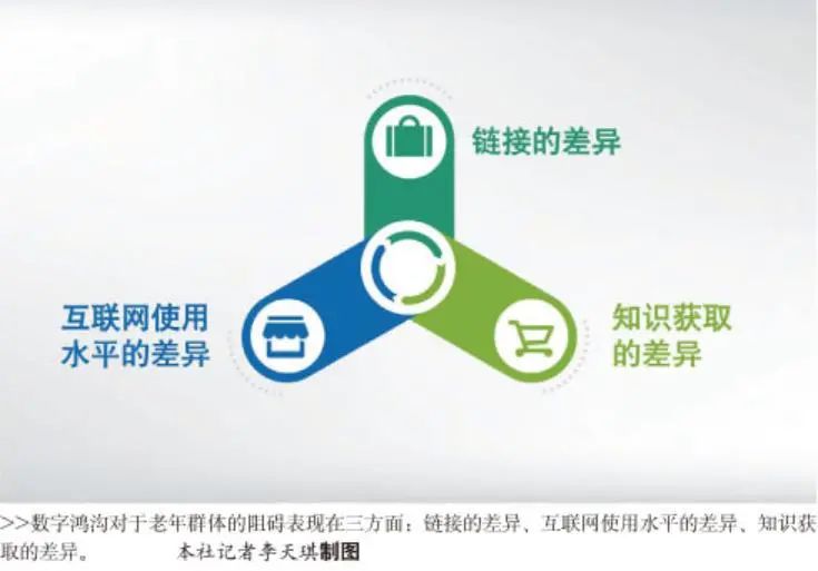 数字鸿沟对于老年群体的阻碍表现在三方面:链接的差异、互联网使用水平的差异、知识获取的差异。具体表现在,老年群体使用互联网技术产品较年轻人相对单一,接受教育水平低等原因导致大量功能不会使用,整体网络素养较低、对信息真伪的识别能力较弱,常常成为网络诈骗、谣言、虚假广告等网络风险的受害者和传播者。