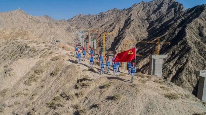 ▲中交集团坚持围绕生产抓党建、抓好党建促生产,通过建立党员示范岗、党员突击队等,推动基层党组织战斗堡垒作用和党员先锋模范作用有效发挥。图为中交集团新疆乌尉公路包PPP项目依若高速施工现场,项目党员们挥舞着党旗。