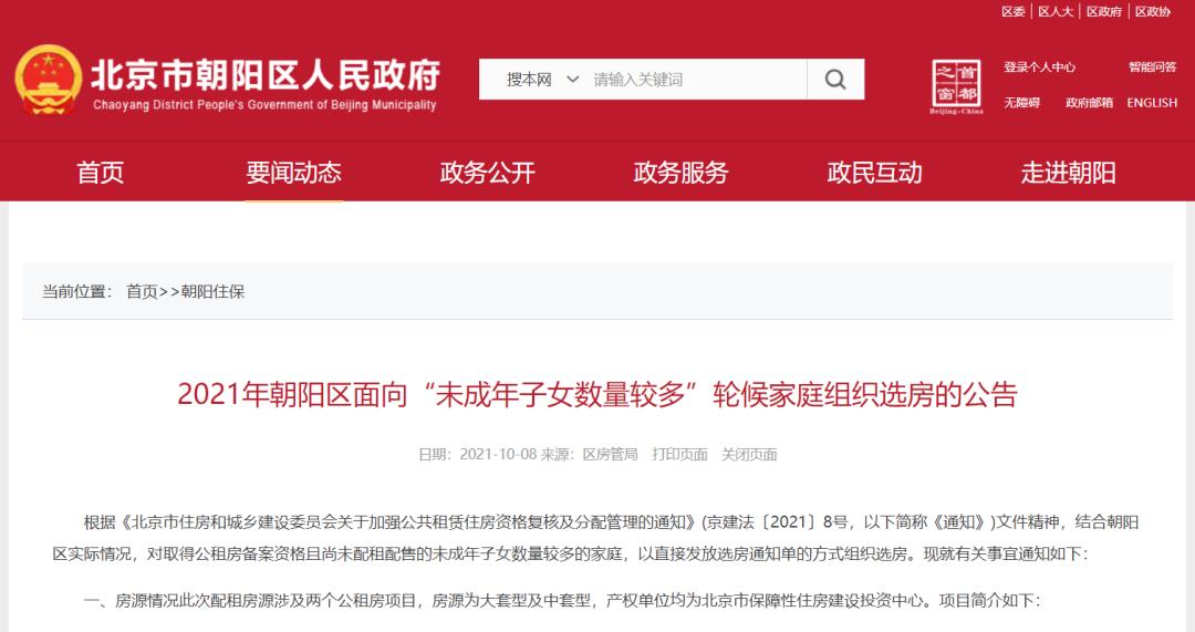 朝阳区房管局10月8日的公告显示,配租对象是2021年09月30日(含)前取得公共租赁住房备案资格且尚未配租配售的“未成年子女数量较多”的朝阳区轮候家庭。