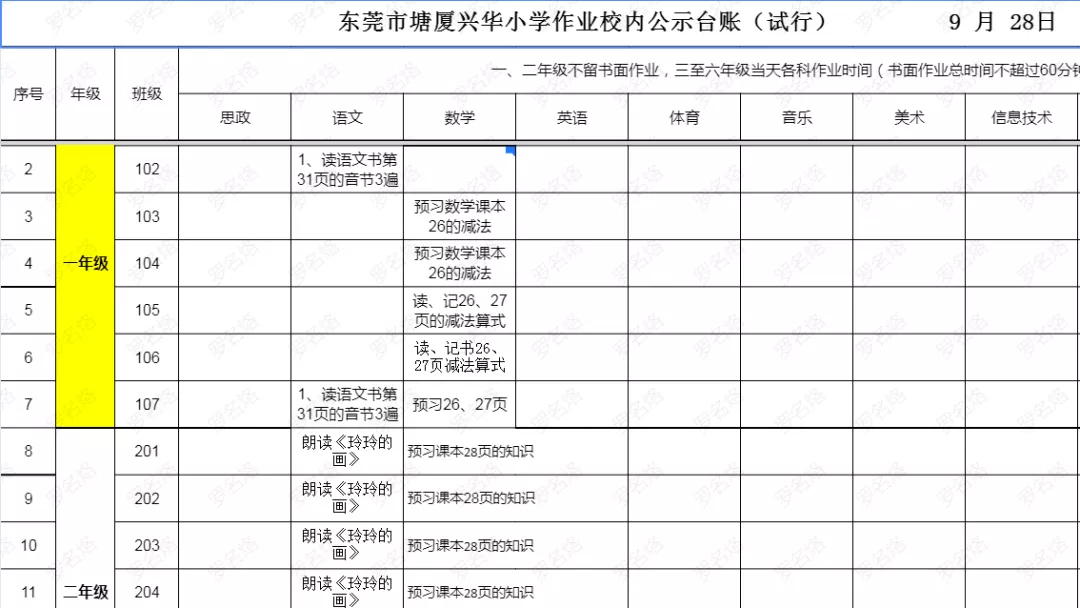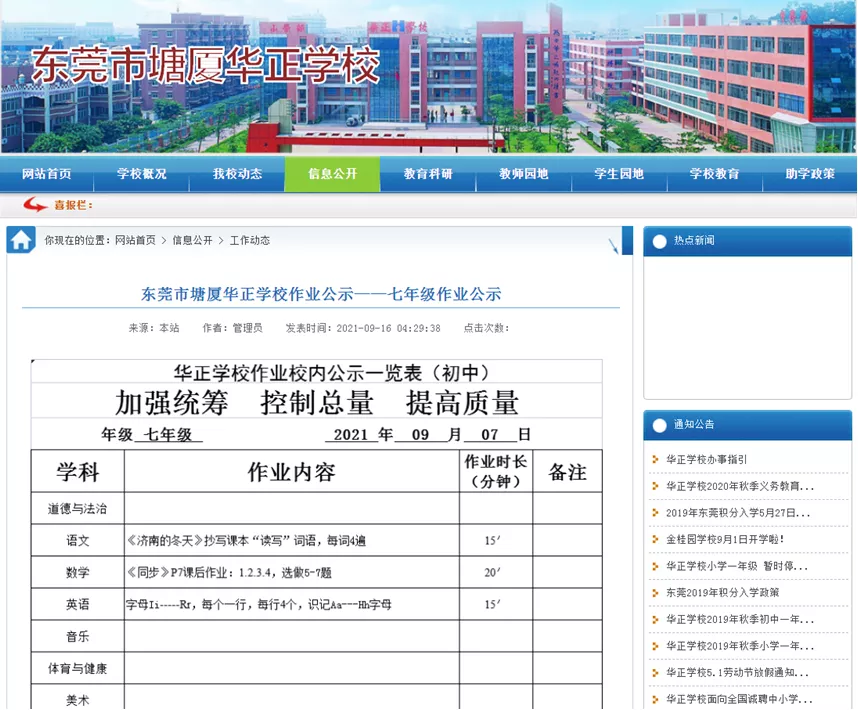 塘厦兴华小学建立作业校内公示制度,将作业内容、作业用时等信息在校内进行公示,接受师生和家长群众的监督。