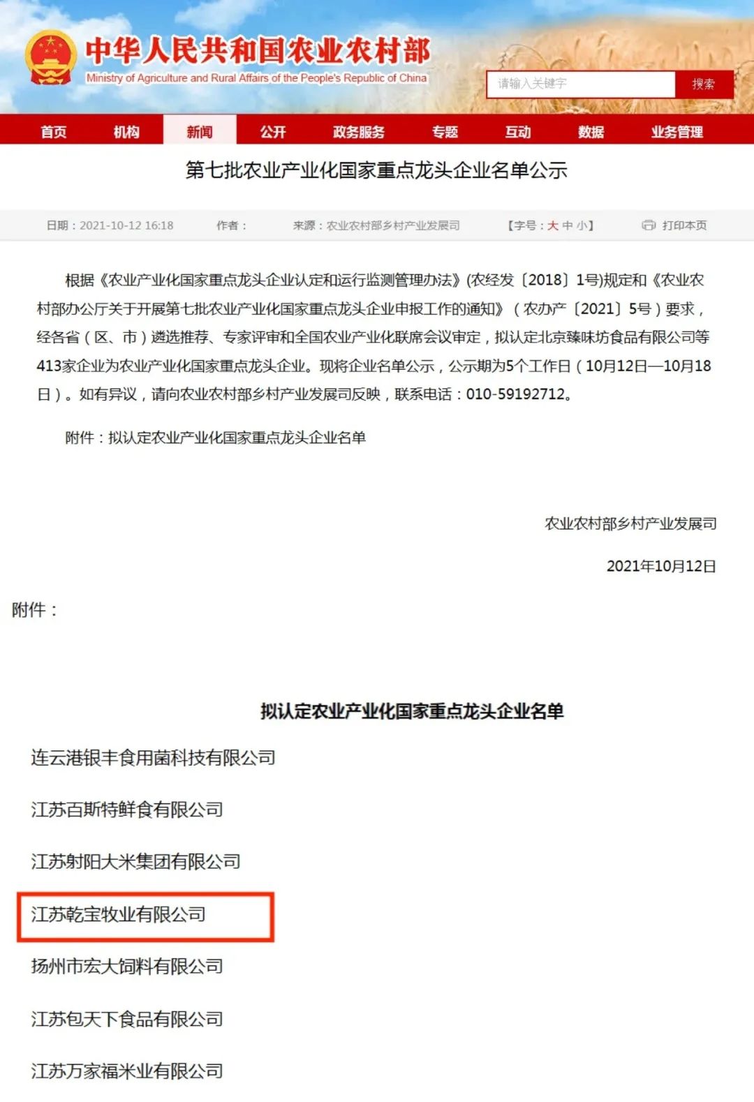 10月12日,农业农村部发布了第七批农业产业化国家重点龙头企业名单公示,江苏省盐城市亭湖区企业江苏乾宝牧业有限公司入选。