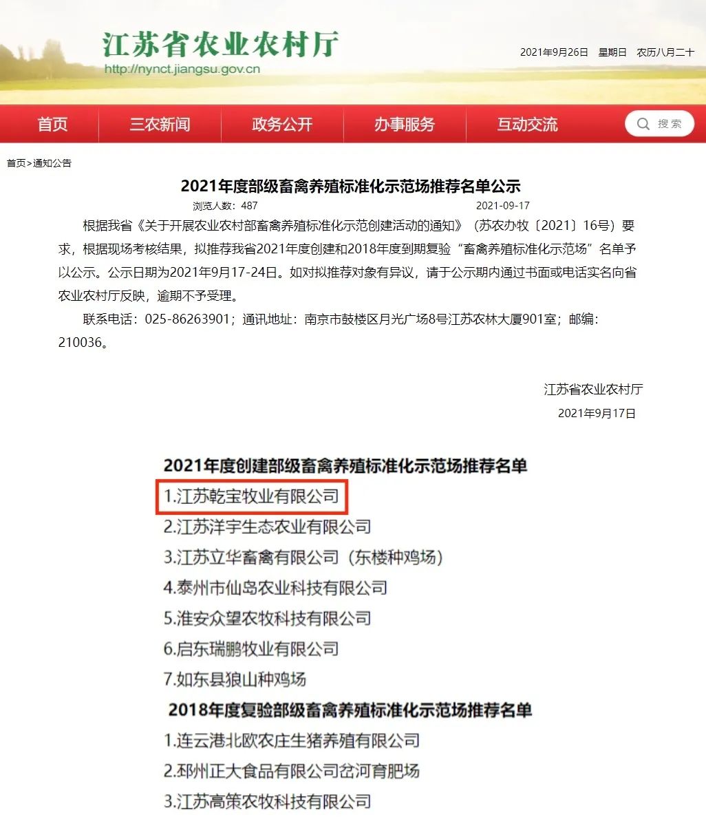 就在前不久,江苏省农业农村厅发布了2021年度部级畜禽养殖标准化示范场推荐名单公示,江苏乾宝牧业有限公司也入选2021年度创建部级畜禽养殖标准化示范场推荐名单,是江苏省盐城市唯一一家上榜企业。