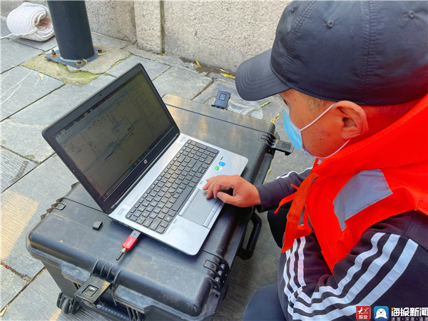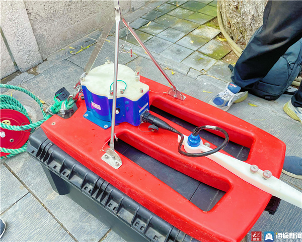 记者在现场看到,工作人员准备好测量断面水流的微型声学多普勒流速剖面仪(简称微型ADCP)与移动式测流绳等设备,并将微型ADCP通过蓝牙连接至手提电脑上,点击鼠标,便可一键测量水流数据。