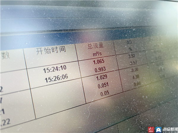 这边测量完毕,几米外的电脑上立刻显示出数据。数据显示,12日观澜桥断面水流的流量往返数据分别是1.065m3/s与0.993m3/s,误差不到5%,属于“较精准的数据”。