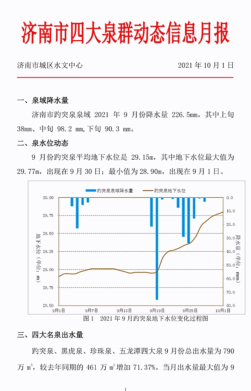据张翔介绍,自2010年7月,受济南市城乡水务局委托,济南市水文中心使用自动流量监测系统、微型ADCP、超声波流速仪等设备,对四大泉群进行出水流量监测,并定期向保泉单位提供泉水统计数据。济南市水文中心密切关注泉水信息,每月定期向济南市政府及保泉相关单位报送各泉群的水位流量信息,定期编制《济南市四大泉群动态信息月报》和四大泉群流量统计表,年底报送泉水年度报告,为保障泉水的持续喷涌提供了可靠的水文技术支撑。