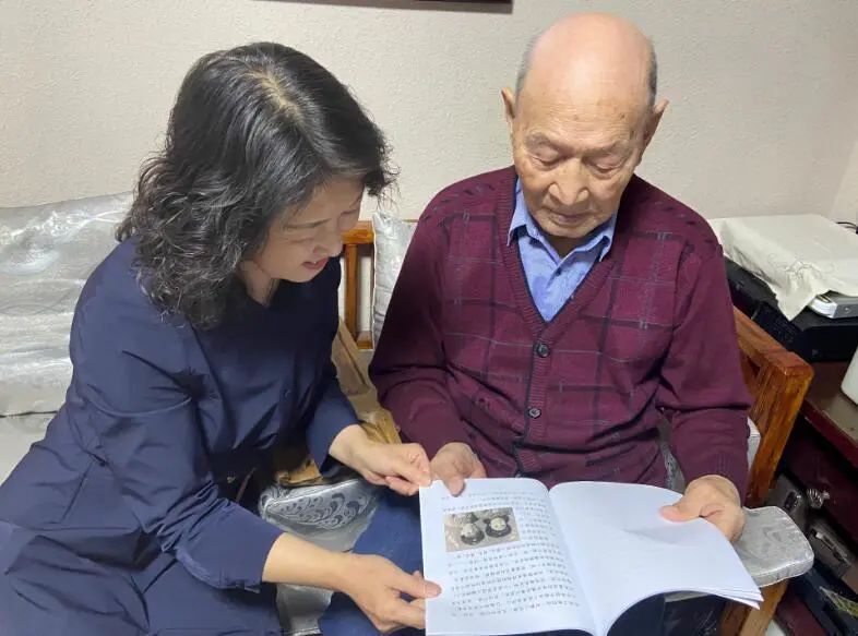 李昌言和女儿李海华一起看回忆录。