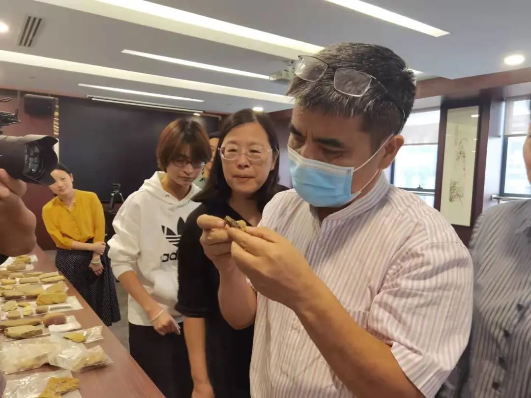蒋乐平在辨认夹炭红衣陶