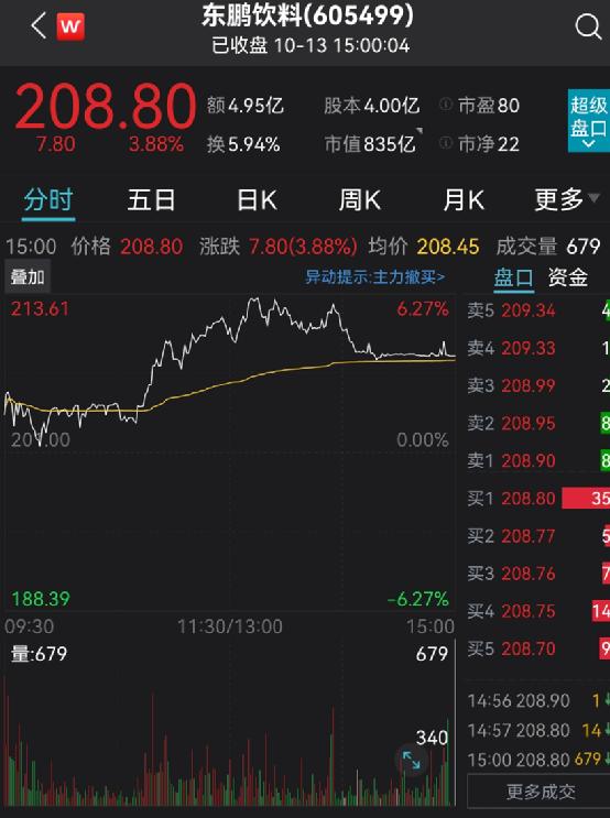 从股价表现来看,东鹏饮料在今年5月上市以来收获十几个涨停板,随后有所震荡。今天该股盘中一度涨超6%,截至收盘上涨3.88%,报收208.80元/股,总市值为835亿元。东鹏饮料最新股价较发行价涨超300%。