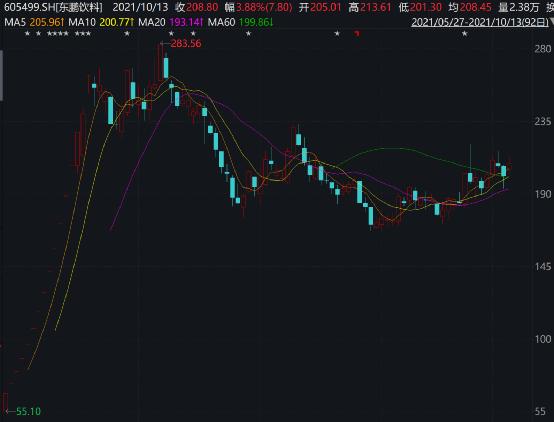 “国内功能饮料第一股”东鹏饮料(605499)在今年5月登陆上交所主板,上市便收获15个涨停板,到今年7月一度涨至283.56元/股的阶段高点,彼时总市值突破千亿。