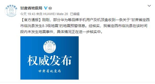 据@甘肃省地震局 10月13日发布官方通报称:刚刚,部分华为等品牌手机用户及机顶盒收到一条关于“甘肃省定西市临洮县发生8.3级地震”的地震预警信息。经核实,甘肃省定西市临洮县在该时间段内未发生地震事件,具体情况正在进一步核实中。