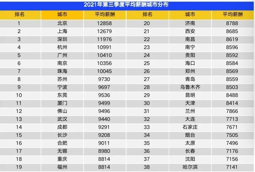 根据智联招聘发布的最新数据显示,2021年第三季度全国平均薪酬达9739元/月,环比上涨4.2%,并且较去年同期的8688元/月高12.1%。