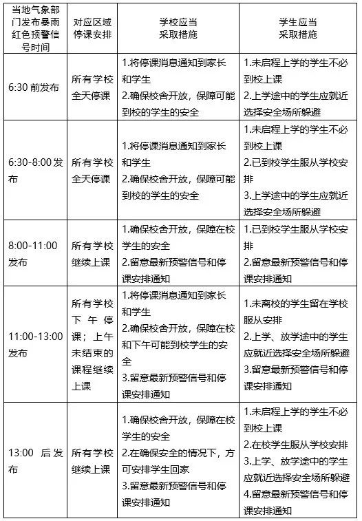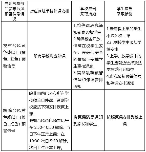 比如,气象部门发布台风黄色或以上预警信号时,所有学校均应停课。其中,未启程上学的学生不必到校上课,上、放学途中学生应就近选择抵达学校或返回家中。