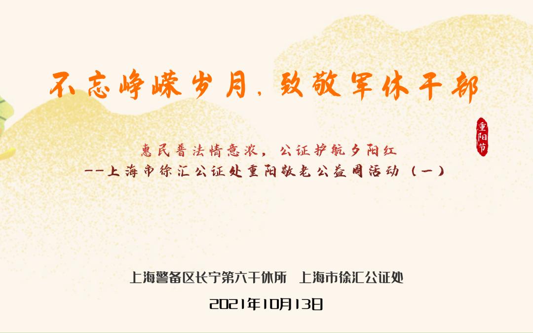 10月13日重阳节前夕,上海市徐汇公证处“惠民普法情意浓 公证护航夕阳红”重阳敬老公益周活动走进上海警备区长宁第六干休所,开展“不忘峥嵘岁月 致敬军休干部”活动,为经历过抗日战争、解放战争、抗美援朝战争等不同年代“最可爱的人”,提供公证咨询普法服务。